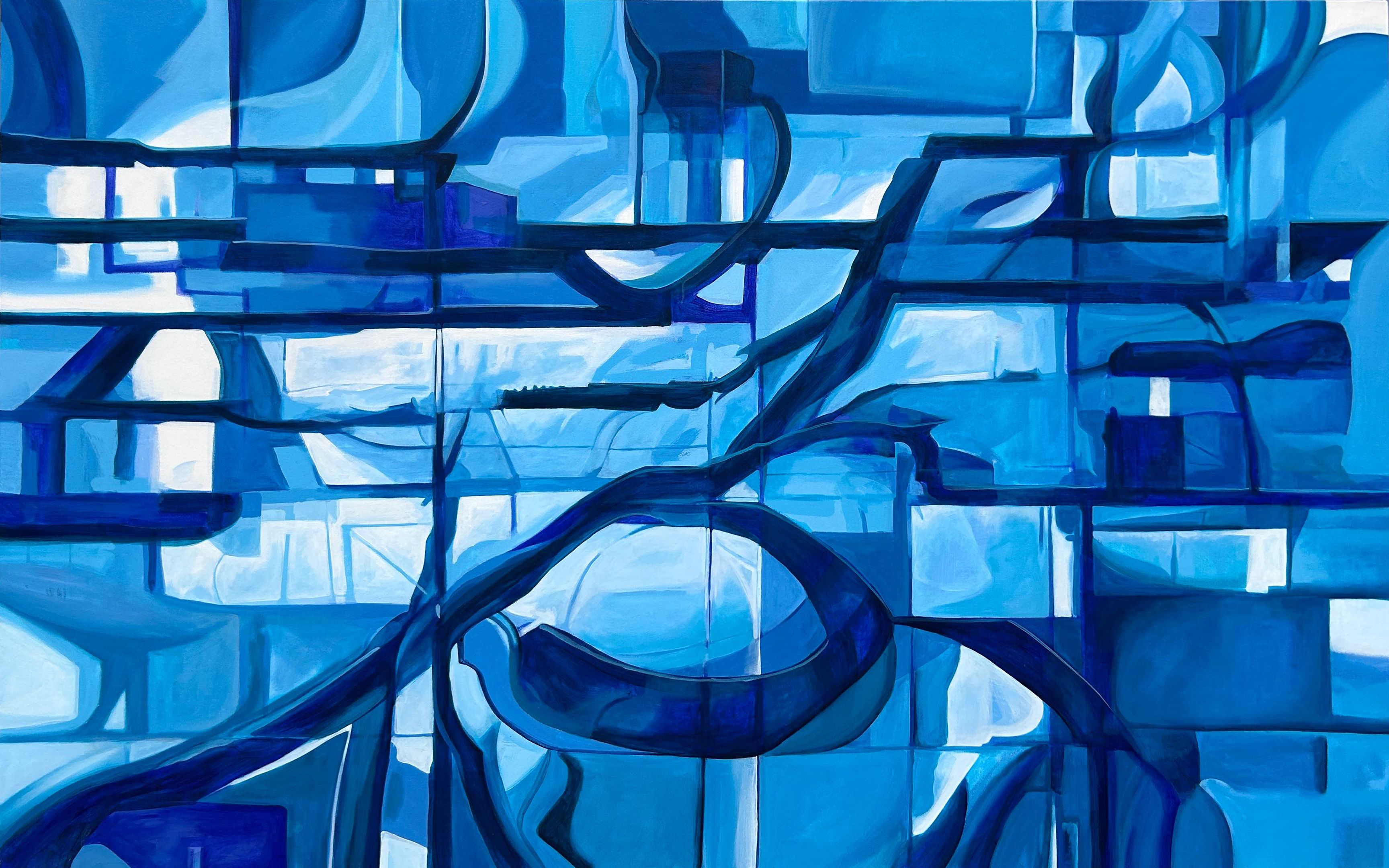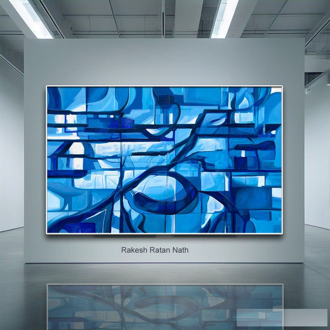 In this Painting, Rakesh Ratan Nath explores the language of abstraction through layered shades of blue that flow across the canvas like interconnected pathways. Geometric forms dissolve into fluid lines, creating a rhythmic balance between structure and movement. The painting evokes a sense of depth and quiet introspection, where transparency and overlap suggest shifting memories, inner landscapes, and unseen connections. The dominant blue palette conveys calm, contemplation, and emotional resonance, inviting the viewer to navigate the work slowly and discover harmony within its complex visual network.