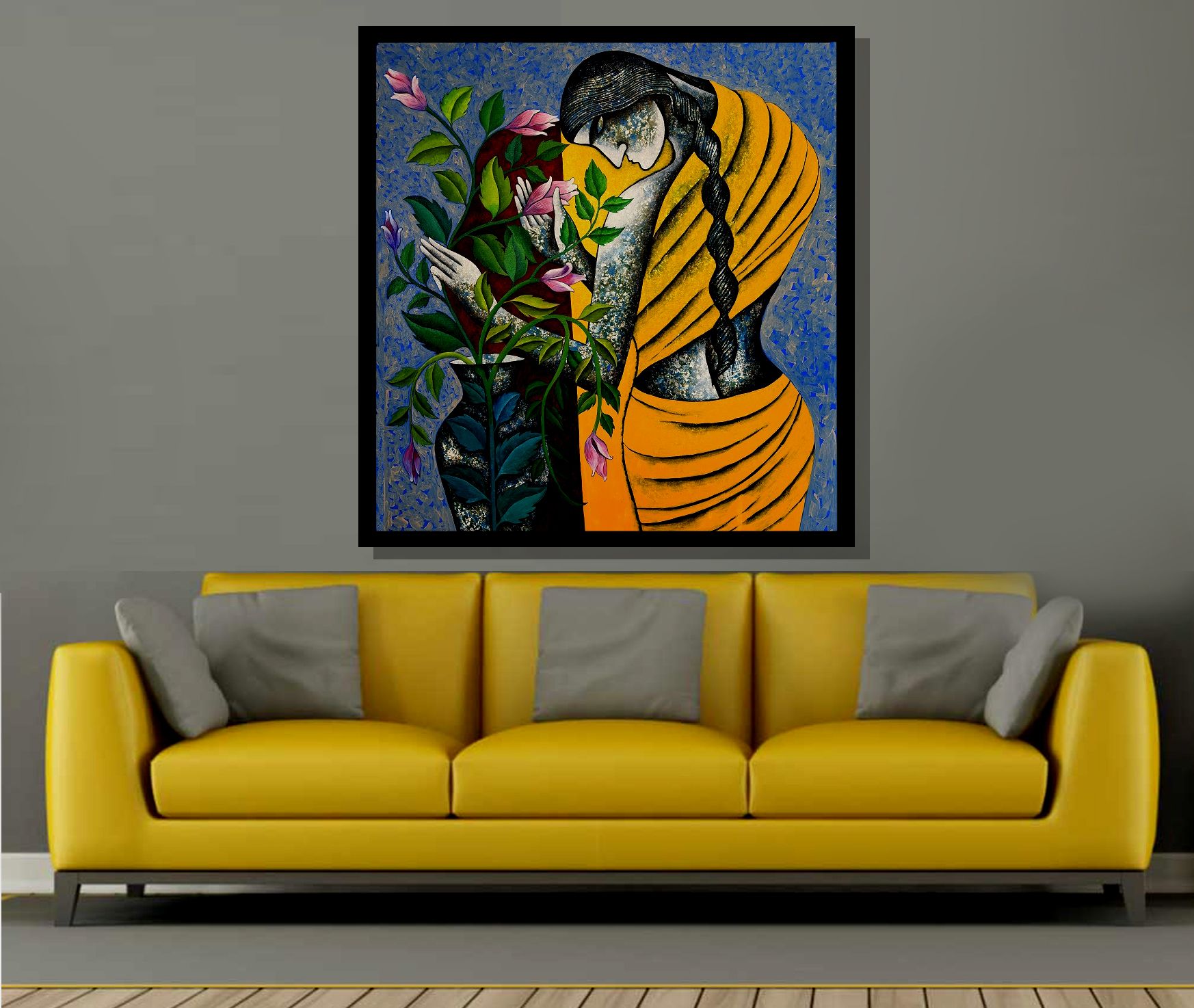 This painting portrays a woman draped in a radiant yellow saree, her body curving gracefully as she leans toward a vase of blossoming pink flowers. The artist blends human emotion and nature through striking symbolism. The woman’s gesture of leaning toward the flowers suggests a longing for connection, tenderness, and renewal. Her face, half-hidden in contemplation, reveals an inner world filled with unspoken emotions. The long black braid cascading down her back signifies timeless femininity and quiet strength. The blue and textured background creates a serene yet introspective atmosphere, contrasting beautifully with the warmth of the yellow drapery. The leaves and flowers extending from the vase appear almost alive, as if responding to her presence, merging the boundaries between the woman and nature. Through vivid colors and abstract stylization, the artist conveys the harmony between the external beauty of the world and the internal depth of the soul. The work resonates with themes of solitude, resilience, and grace, offering the viewer a meditative experience. Each element, from the delicate floral details to the folds of the saree, contributes to a lyrical composition that celebrates the eternal bond between human emotion and the natural world’s quiet rhythm.