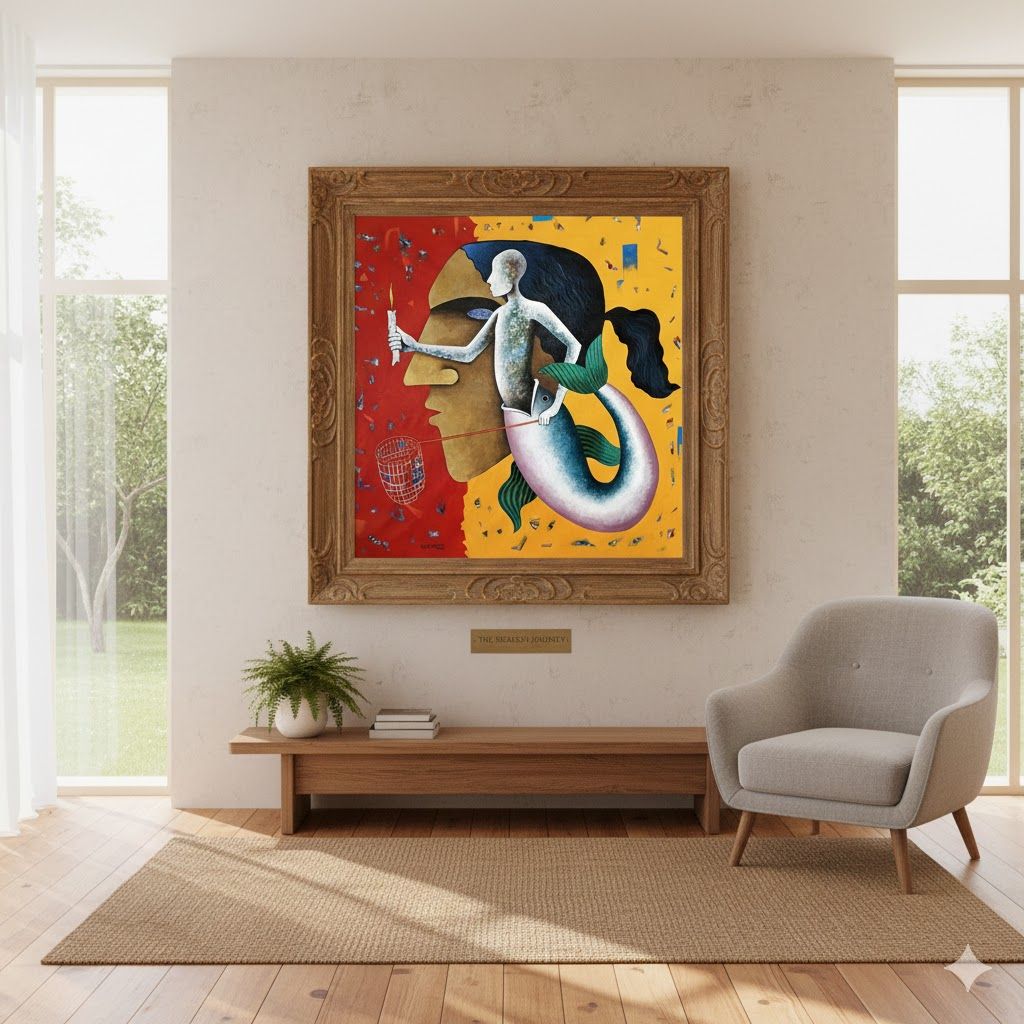 From a mythological perspective, "The Seeker’s Lantern" depicts the "Hero’s Journey" through the lens of spiritual evolution. The hybrid nature of the seeker, merging human form with aquatic life, hints at the evolution of consciousness from primal instincts toward enlightenment. The net held by the figure suggests a quest to capture fleeting truths or "pearls of wisdom" hidden in the vast ocean of existence. The vibrant, textured background is scattered with mosaic-like fragments, perhaps representing the shattered pieces of a universal truth that the seeker is tasked with gathering. It is a visual meditation on the effort required to remain illuminated.