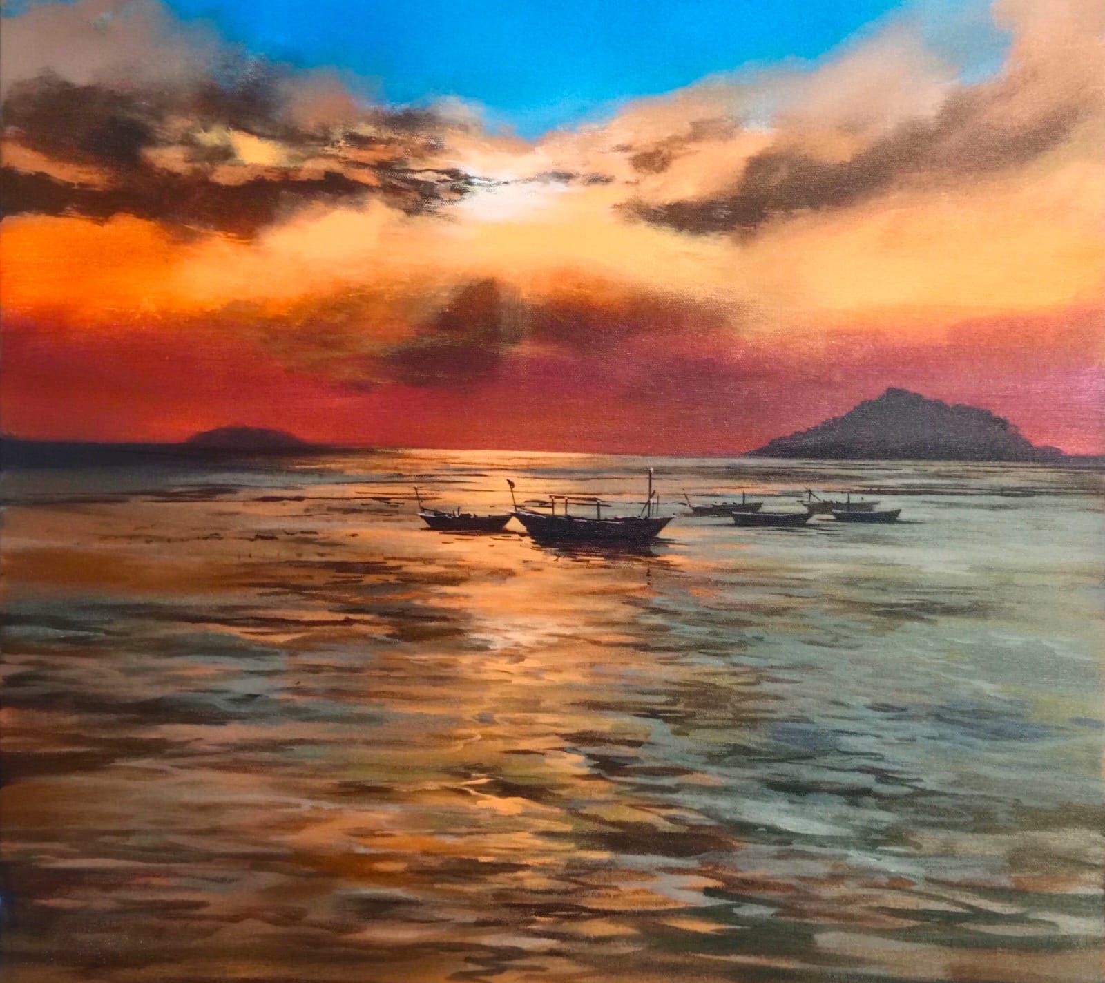 सूर्यास्ताची वेळ, शांत समुद्र आणि पाण्यात नांगरलेली लहान मासेमारी बोटी
