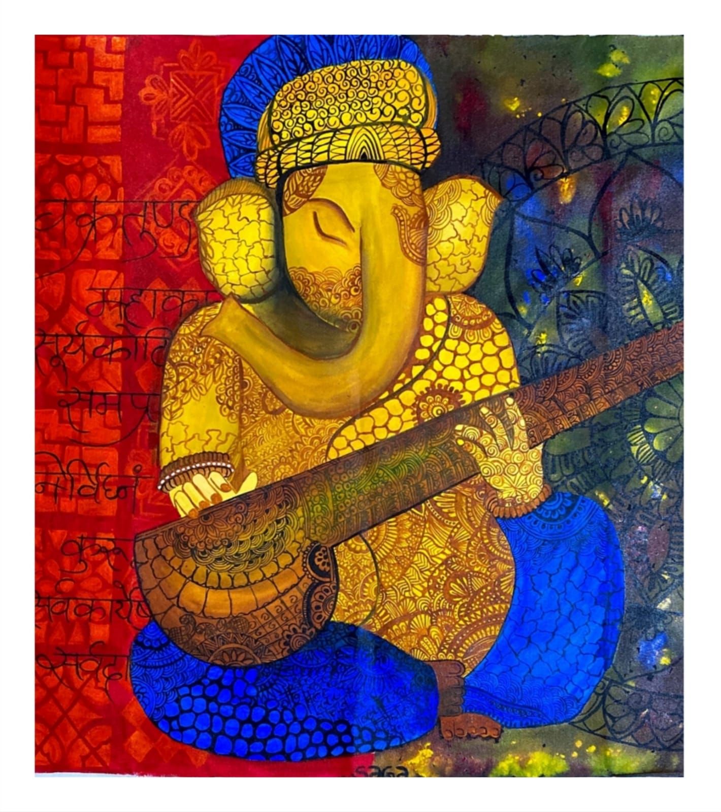 Ganapati is said to bless his devotees with positivity and wisdom. Intricate mandala detailing surrounds him, representing balance and the universe's infinite nature. In the background, a sacred shloka offers spiritual guidance, inviting peace and introspection into the space.