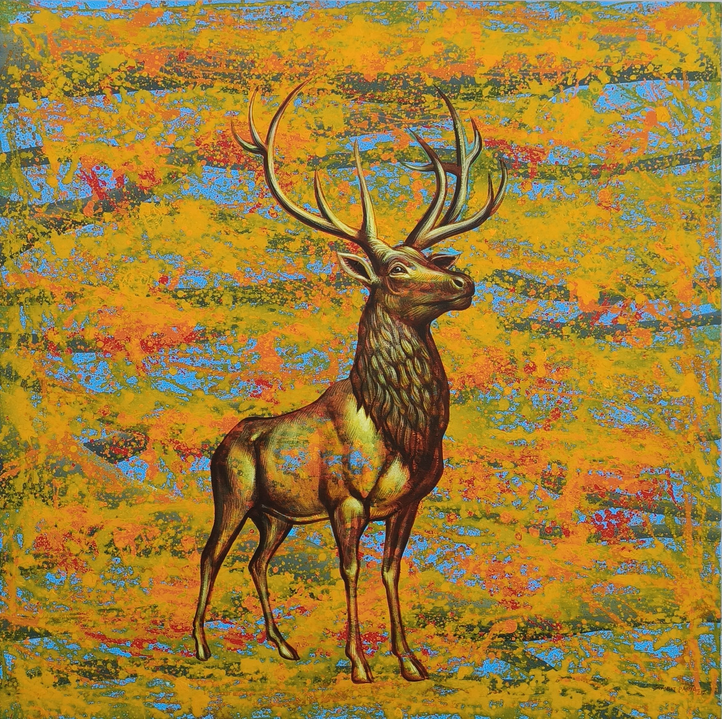 This painting tells the story of a stag who stands calm and proud in the heart of a vibrant wilderness. The colorful background mirrors the energy of the forest around him: ever-changing, alive, and unpredictable. Yet the stag remains steady, symbolizing strength, awareness, and dignity. His antlers stretch upward like branches reaching for the sky, connecting the earth to something greater. Through this artwork, I wanted to capture not just the beauty of the animal, but the quiet confidence of nature itself — a reminder that true power is often rooted in stillness