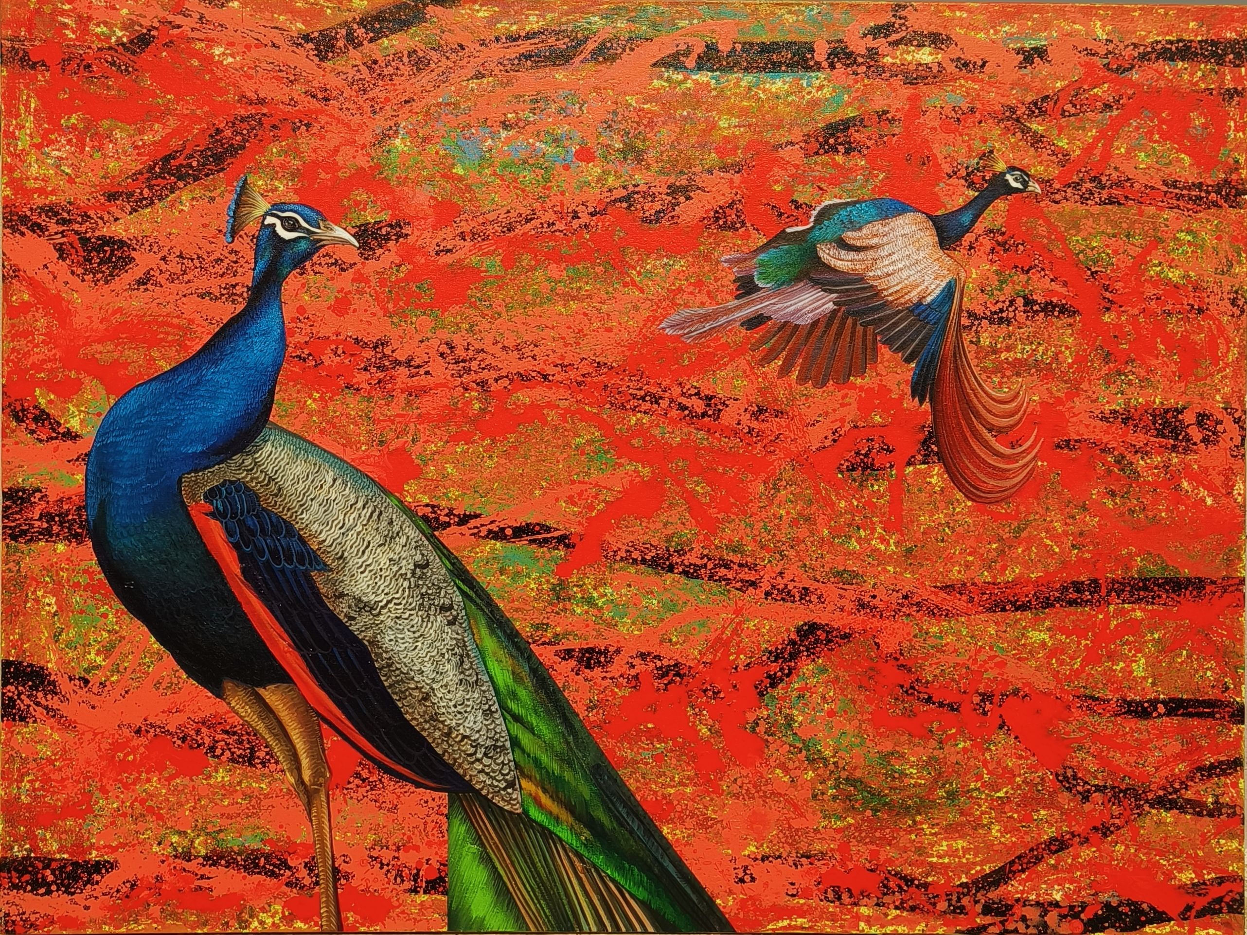 Bathed in the vibrant bloom of spring, the peacocks move through a world lit by the fiery blossoms of the palash tree. One rests in serene elegance, absorbing the season’s quiet warmth, while the other lifts into flight, carrying the colours of renewal on its wings. Their presence turns the landscape into a living celebration—where nature sings softly of rebirth, tenderness, and the shimmering poetry of a spring morning unfolding in full splendour.