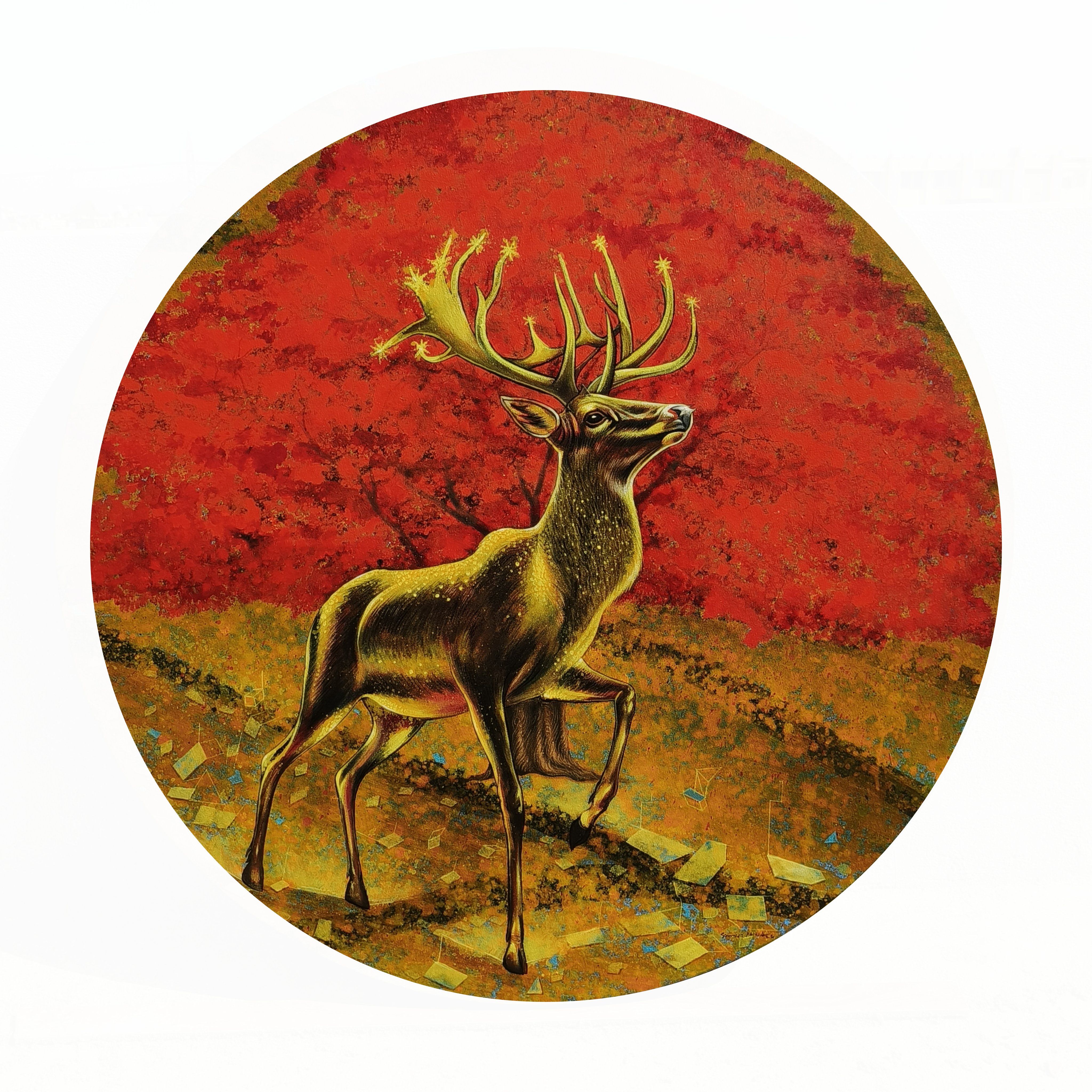 A constructed tension between permanence and rupture unfolds within the circular field. The stag, rendered in gold, operates as both symbol and axis—an embodiment of continuity—while the fragmented planes beneath it destabilize any fixed reading of ground or history. The red tree provide a plenty of shades and memory functions less as a tree and more as a chromatic field of accumulated memory, dense and unresolved. Together, these elements articulate a visual language where heritage is not preserved as a whole, but reassembled through fracture, reflection, and shifting perception.