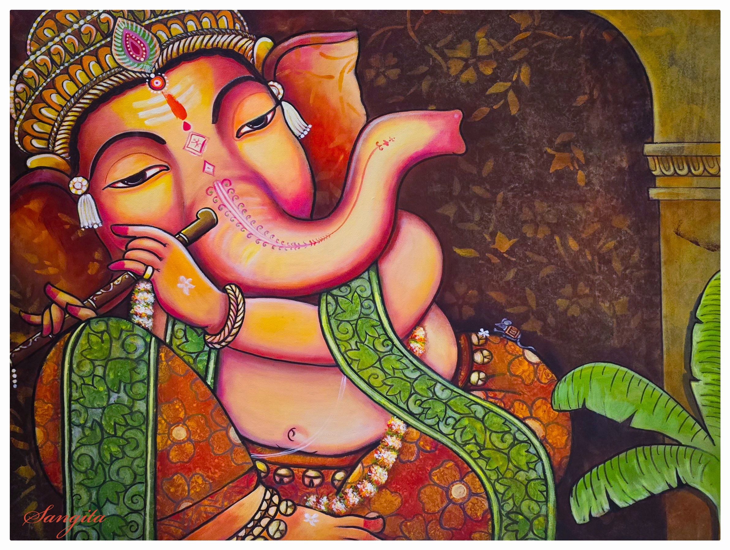 Acrylic painting of Lord Ganesh playing flute.