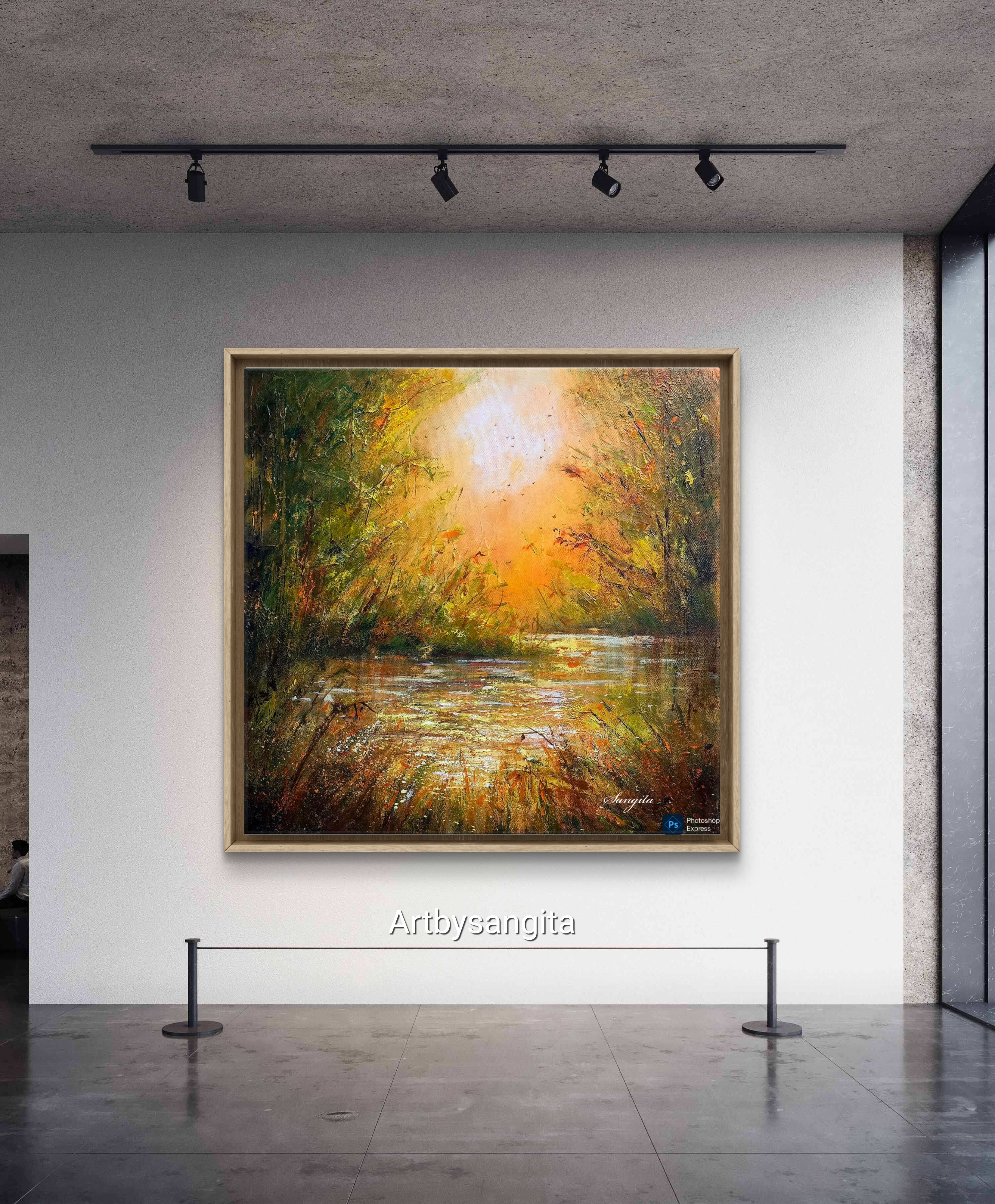 This painting beautifully captures a serene sunset over a tranquil stream. The warm golden-orange glow fills the sky, reflecting softly on the water, while lush greenery and autumn tones frame the scene. It evokes peace, warmth, and the quiet beauty of nature bathed in evening light.