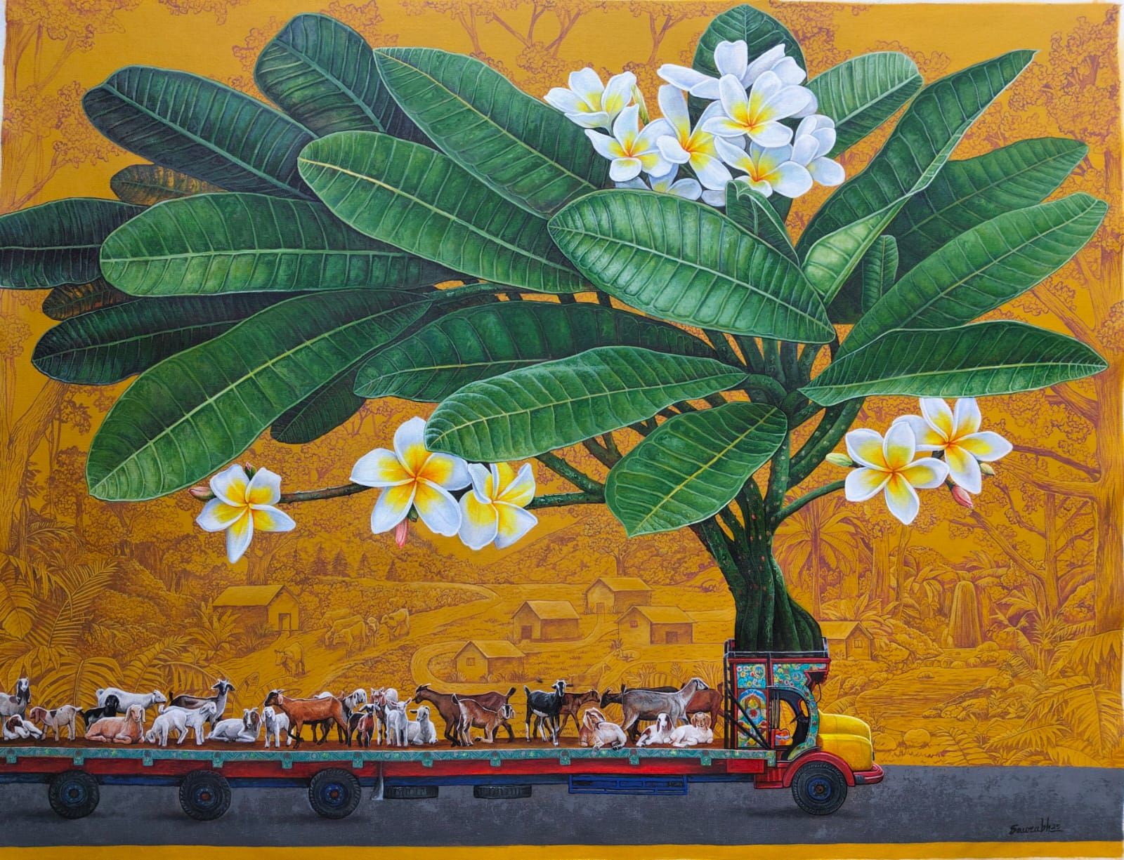 The artwork combines elements of nature, rural life, and transportation in a visually striking, imaginative composition.
