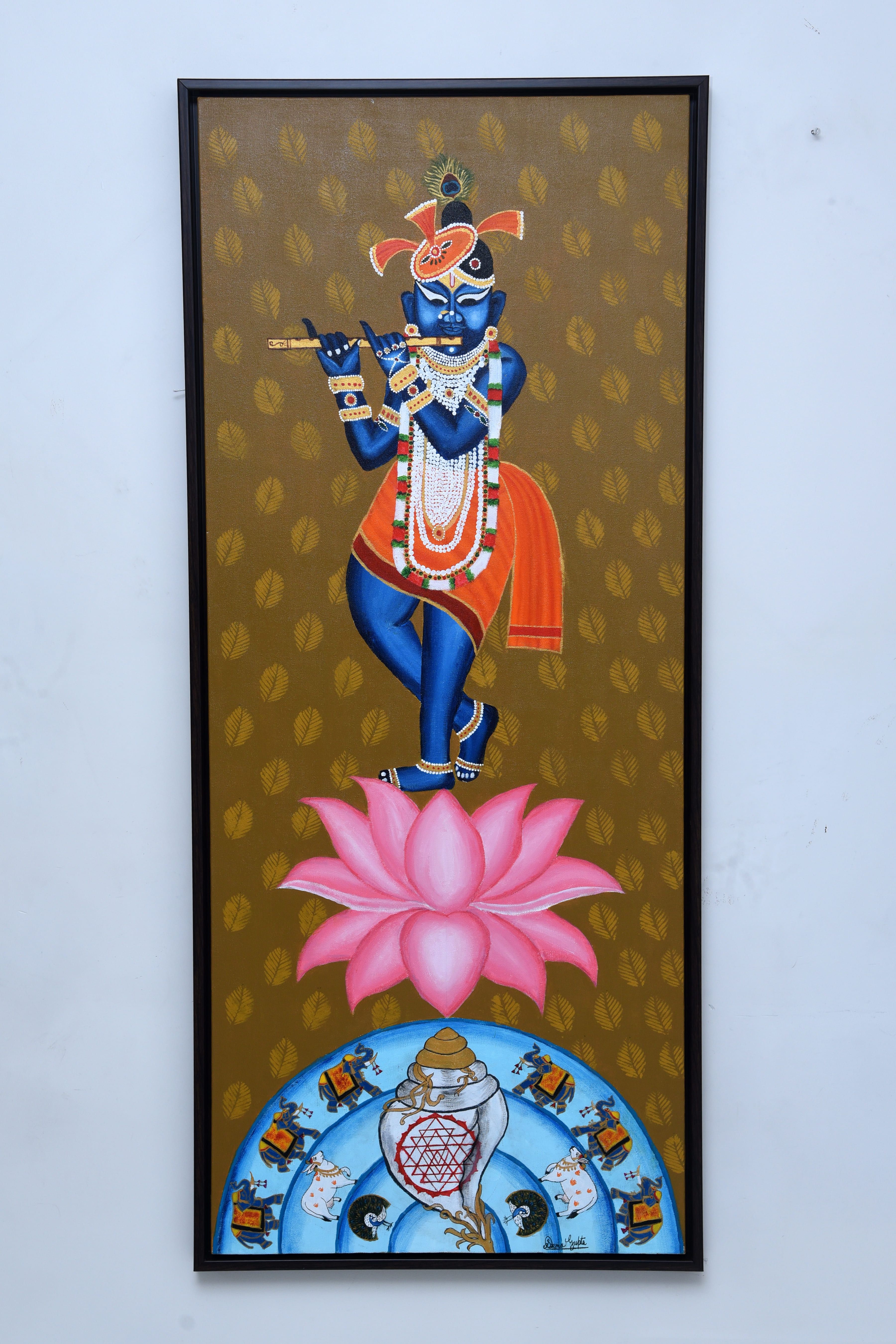 This acrylic on canvas painting (48” x 20”) portrays Lord Krishna in his youthful form, holding the flute with a serene smile. He stands gracefully over a blooming pink lotus, symbolizing purity and divinity. The background is filled with subtle golden leaf patterns, adding richness and depth. On the side, a detailed conch surrounded by elephants, cows, and peacocks highlights themes of prosperity, devotion, and cosmic energy. The artwork brings together spirituality and celebration in a vibrant, elegant style.