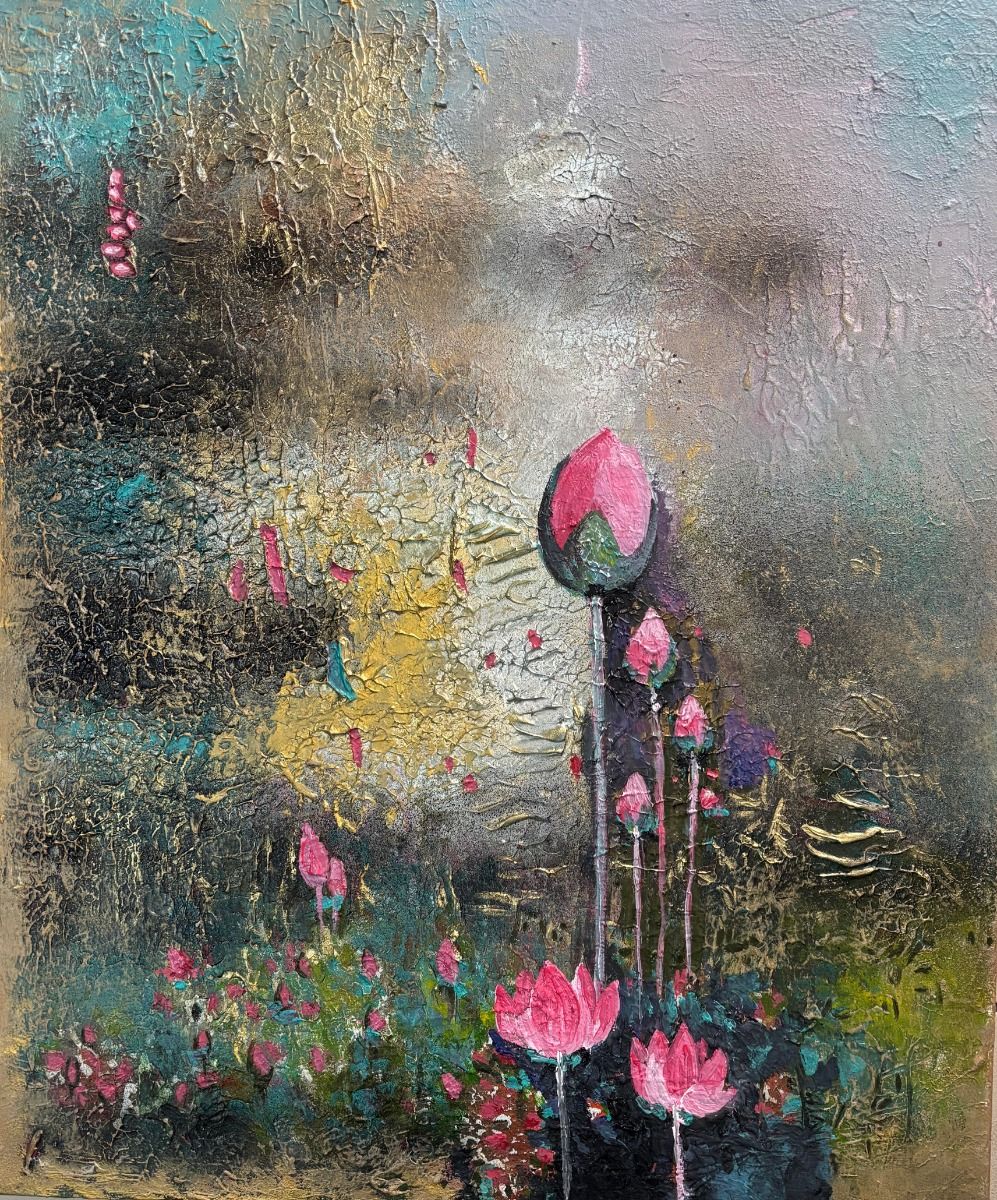 Silent Symphony explores resilience and awakening through abstract lotus landscapes. Built with layered mixed media and tactile textures, the works reflect inner terrains shaped by endurance and time. Gold emerges as earned light—marking moments of clarity against dense, metallic surfaces. Rooted in stillness, this series honors the quiet rhythm of becoming, where growth unfolds silently yet powerfully.