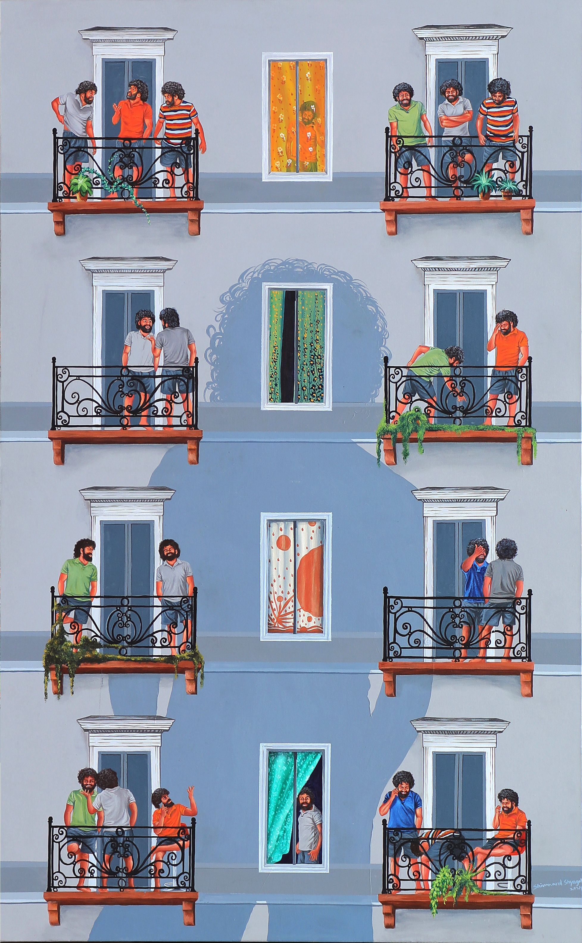 "Shadow" presents a multi-tiered architectural scene, dominated by a series of identical balconies populated by figures who appear to be the same individual in varying poses and attire. The painting's palette is subdued, with a dominant gray for the building's facade, contrasting with the vibrant colors of the figures' clothing and the occasional bright window. The composition is symmetrical, creating a sense of order and repetition, while the slight variations in the figures' actions and the unique window treatments in the central vertical axis add a subtle narrative element.
