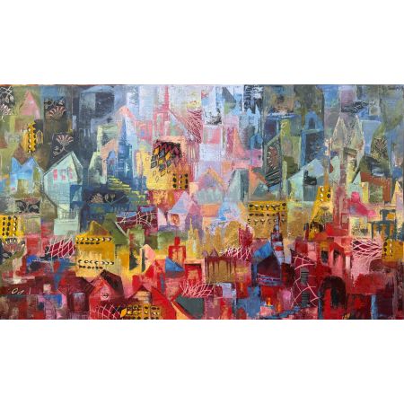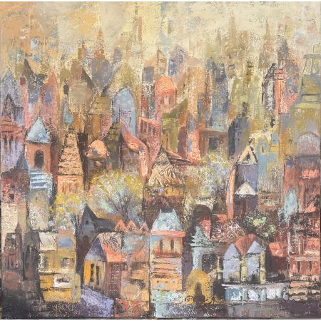 This painting highlights the interplay of the disparate yellow and sienna paints blended together through the use of supporting textures and colours, which allows diametrically opposite shades to reconcile and work together in harmony