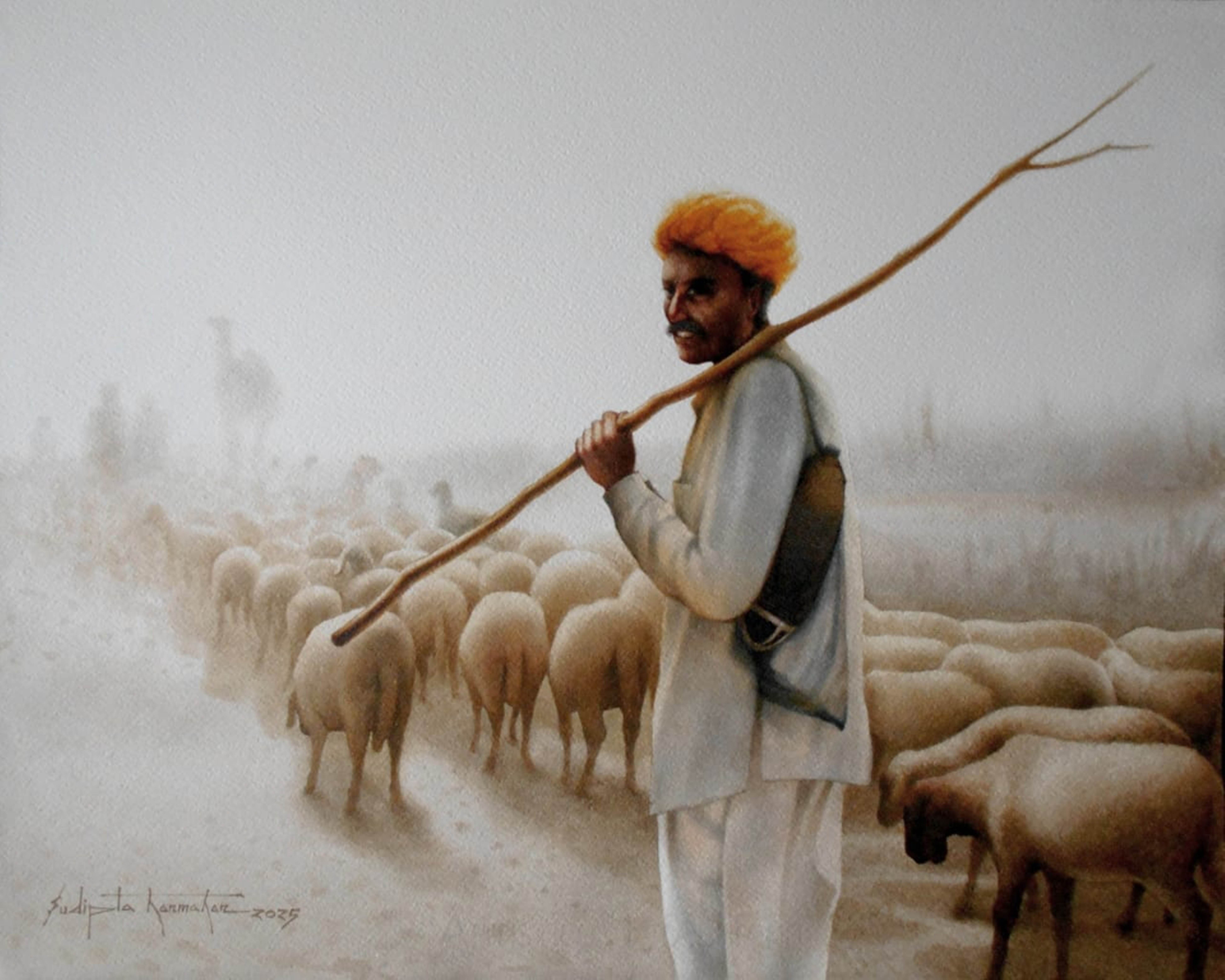 This original watercolor painting shows Shepherd of dessert in a full sunny day is going with his sheep by taking a water bottle and food in a bag on his shoulder. The smile on the face of shepherd is very charming which shows simplicity of the shepherd man and respect towards his work.