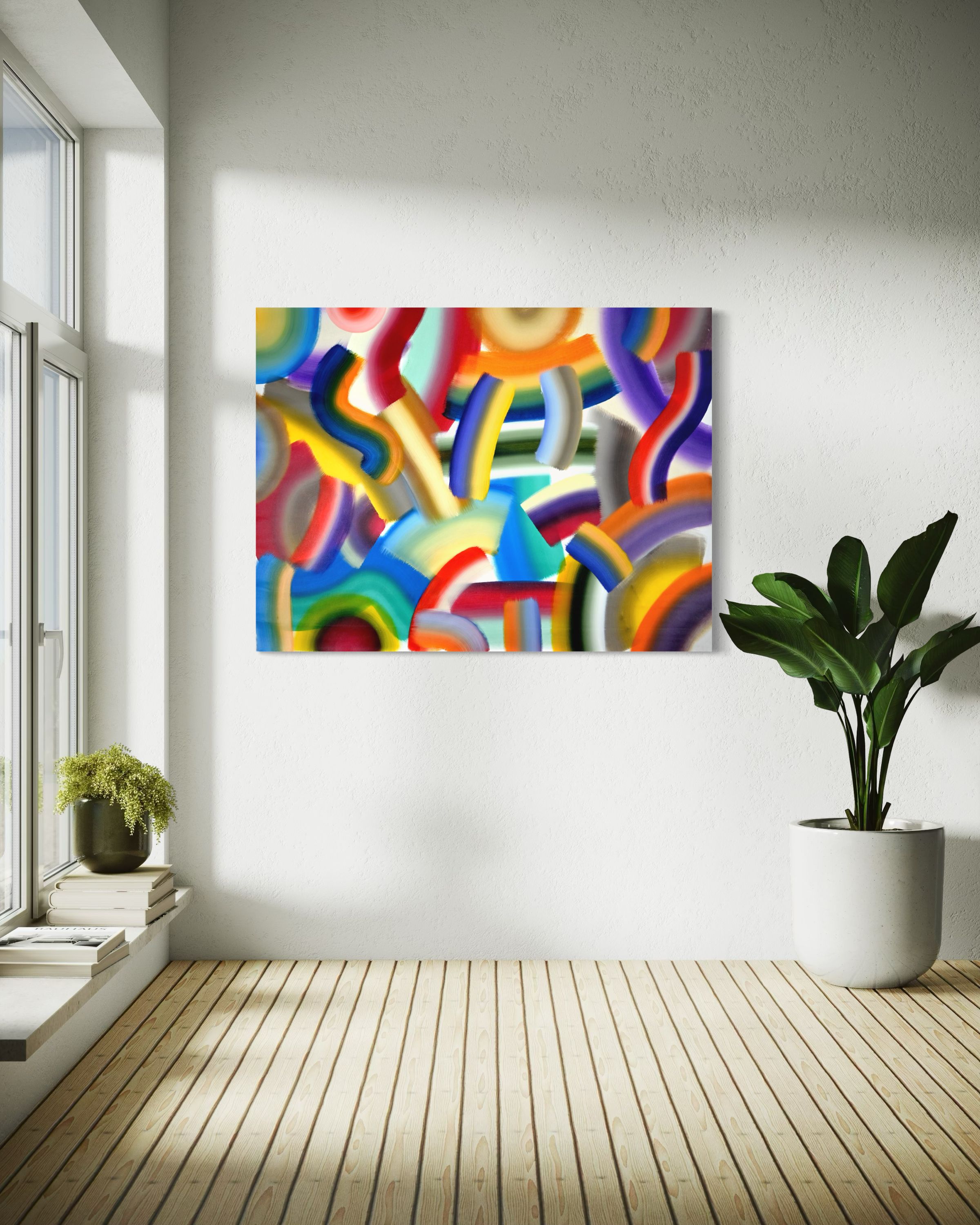This striking artwork is an exuberant explosion of color and form, masterfully blending vibrant hues with dynamic shapes. It showcases a series of intertwined, curving bands, each painted in a spectrum of bold colors—reds, blues, yellows, greens, and purples—that flow seamlessly into one another. The play of light and shadow on these forms creates an illusion of depth, inviting the viewer to explore the layered textures. The composition is both chaotic and harmonious, reflecting a sense of movement and energy. This piece uniquely combines abstract forms with a vivid palette, evoking feelings of joy and spontaneity. Its stimulating visual rhythm captures the eye and the imagination, making it a captivating centerpiece in any space.