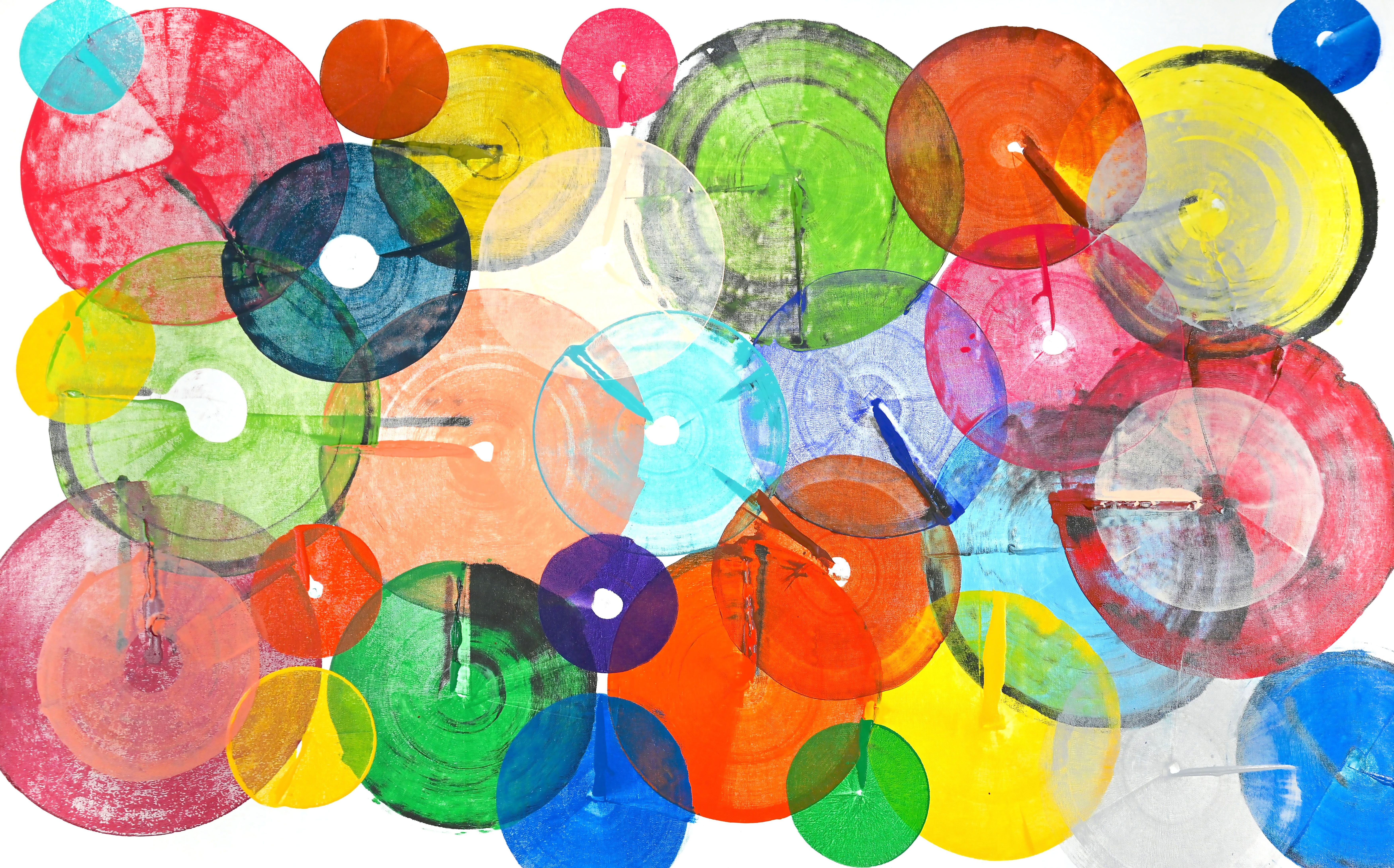 The acrylics on canvas explode with playful energy. The multicolour composition and abstract patterns evoke a sense of gestural abstraction and modernism. The circular forms create a mesmerizing visual experience.