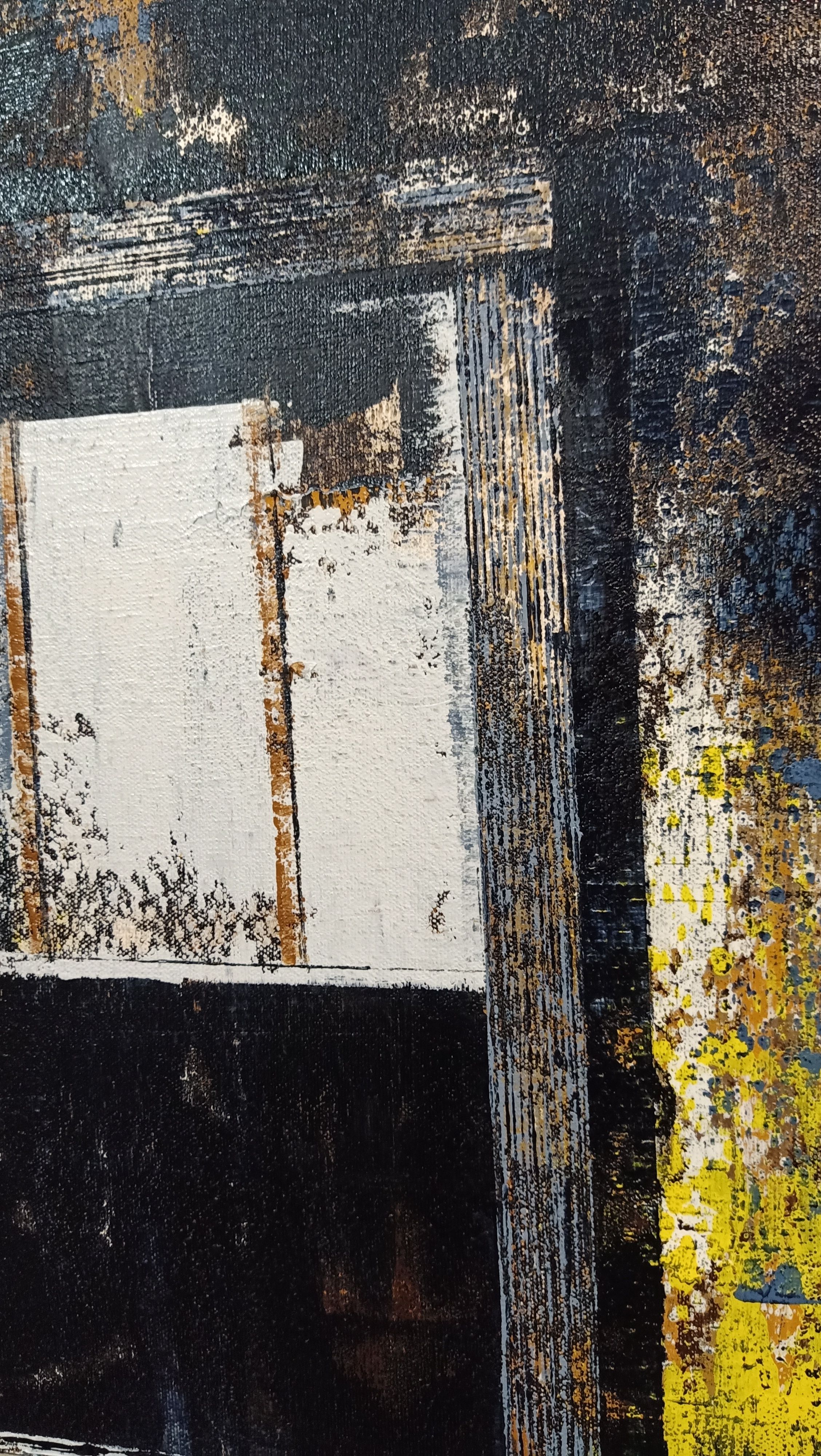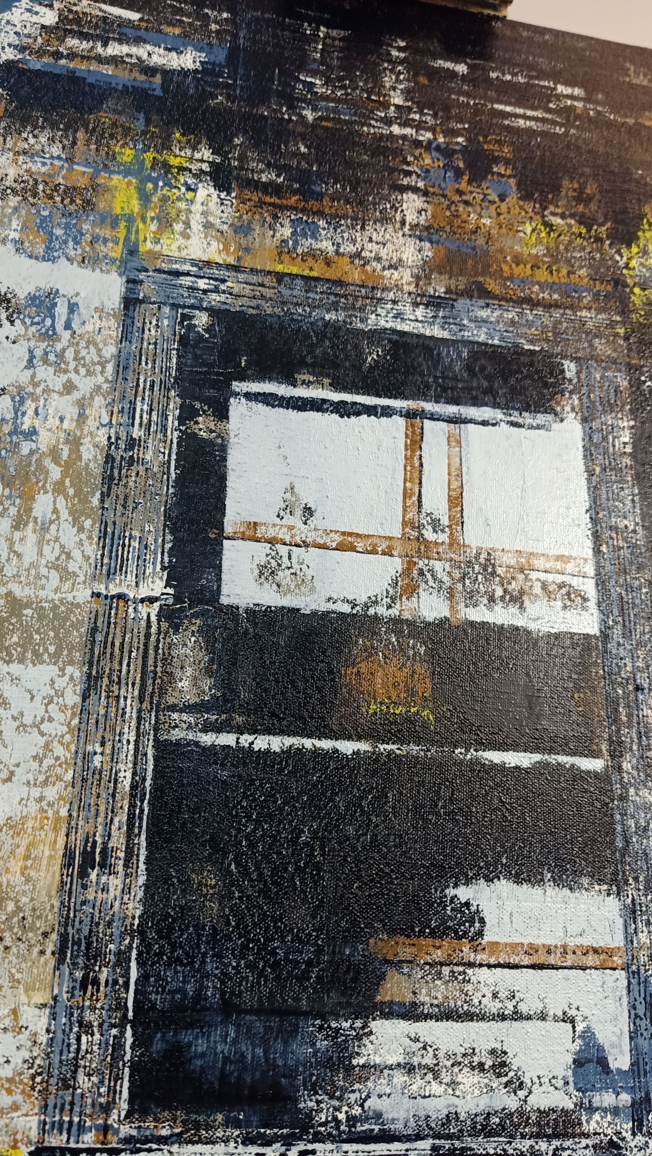 This artwork by explores the beauty of weathered industrial structures through abstract Realism style. Using heavily textured layers of oil paint, it depicts a gritty architectural facade featuring prominent metal fire escapes and multi-pane windows. The high-contrast, atmospheric palette captures a sense of urban decay and the silent, enduring history found within the city's overlooked corners.
