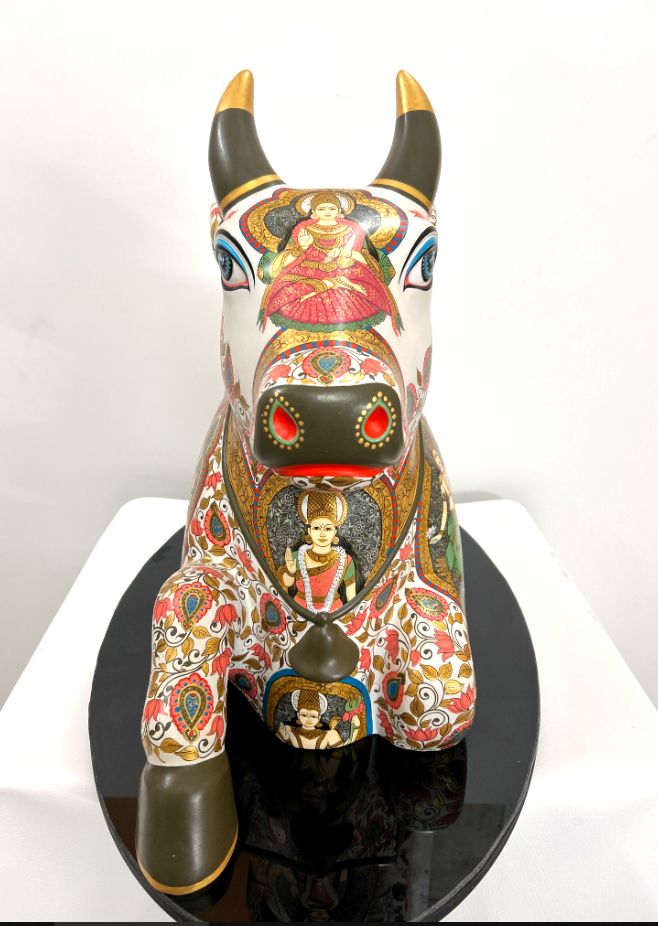 This exquisite Nandi sculpture by artist Upasana Chaudhary is a radiant fusion of Indian mythology, sacred symbolism, and contemporary decorative artistry. Nandi, the divine bull and sacred vehicle of Lord Shiva, is portrayed here not merely as a sculptural form, but as a living canvas of spiritual storytelling.
