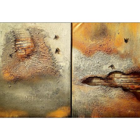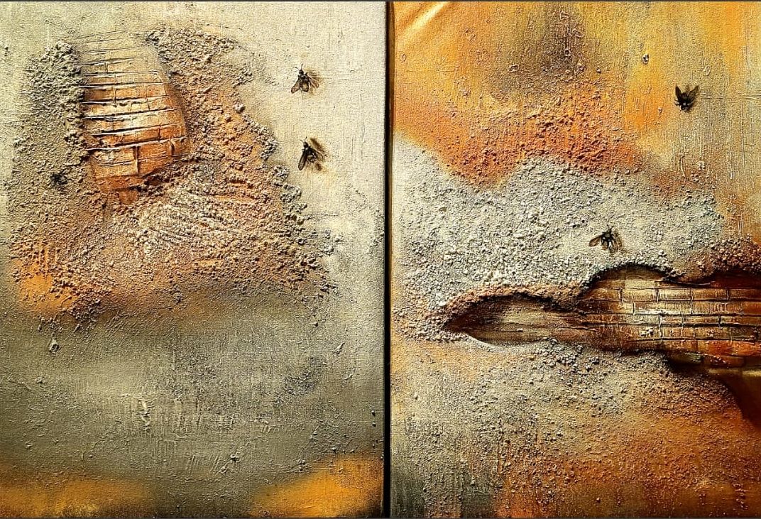 A tapestry of weathered brick unfolds, its rugged surface etched with time's tale, fractured by nature's relentless march. Amidst the crevices, bees labor, symbols of a fragile ecosystem in peril. Each crack a testament to climate's ruthless grip, yet within them lies hope, a call to restore what was lost.